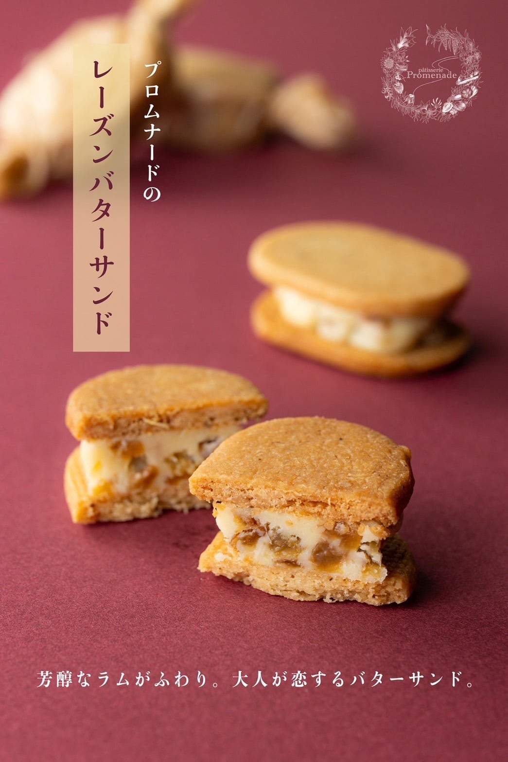 大人のための贅沢な味わいを楽しむ、レーズンバターサンド。バニラの香ばしいサブレに、たっぷりのバタークリームと、ラム酒の豊かな香りが漂うラムレーズンをサンドしました。一口噛むごとに、素材の旨味が溢れ出し、心地よい甘さと風味が広がります。スイーツ好きにはたまらない、贅沢なひとときをお届けします。
